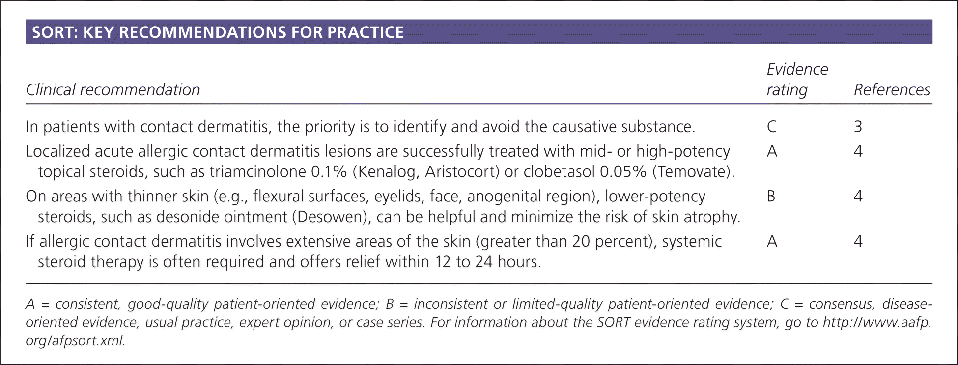 | In patients with contact dermatitis, the priority is to identify and avoid the causative substance. | C | 3 |