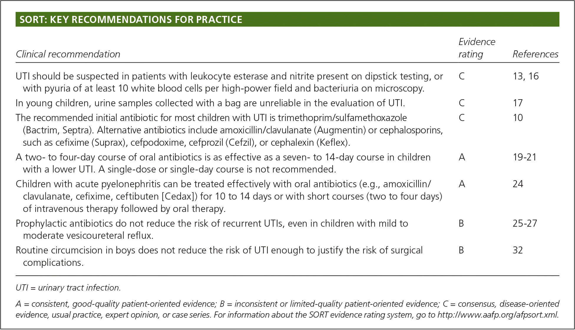 The recommended initial antibiotic for most children with UTI is trimethoprim/sulfamethoxazole (Bactrim, Septra). Alternative antibiotics include amoxicillin/clavulanate (Augmentin) or cephalosporins, such as cefixime (Suprax), cefpodoxime, cefprozil (Cefzil), or cephalexin (Keflex).C10