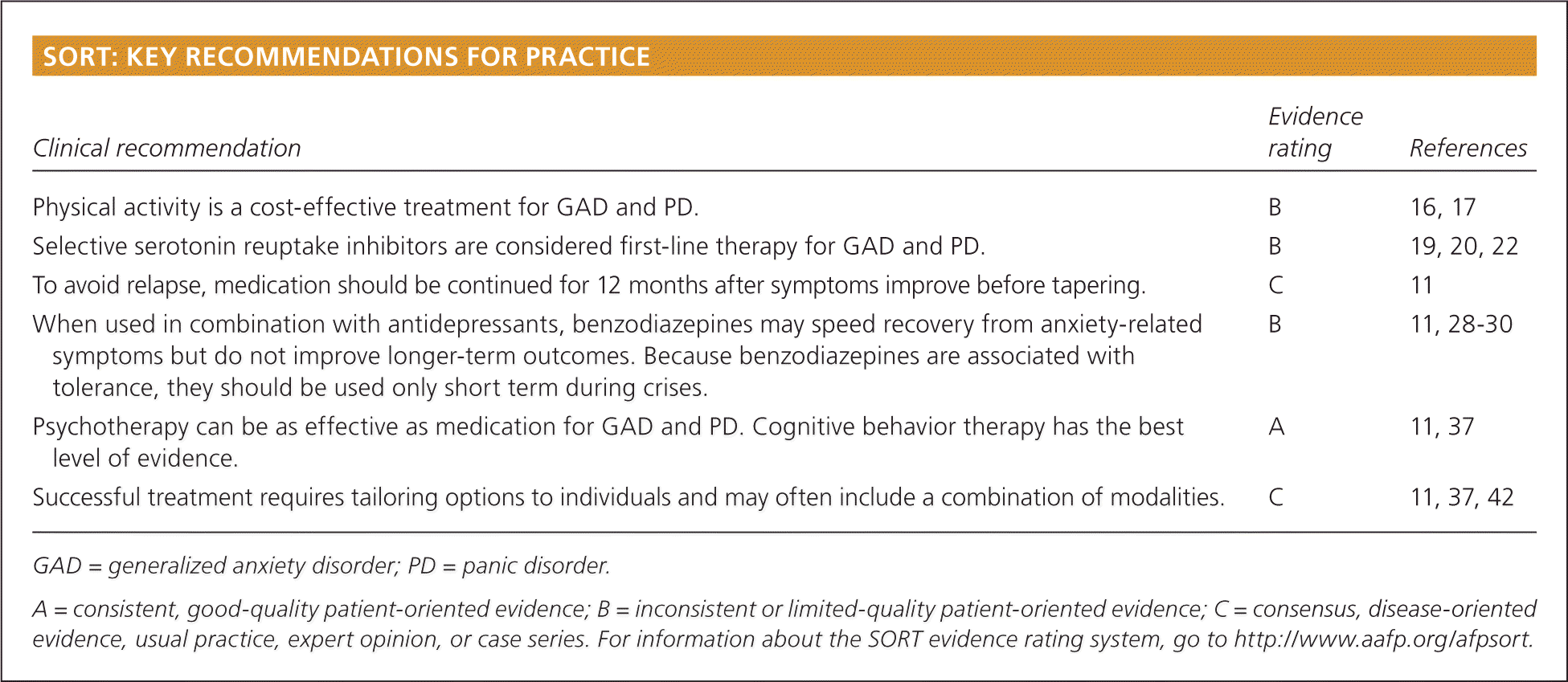 | Psychotherapy can be as effective as medication for GAD and PD. Cognitive behavior therapy has the best level of evidence. | A | 11, 37 |