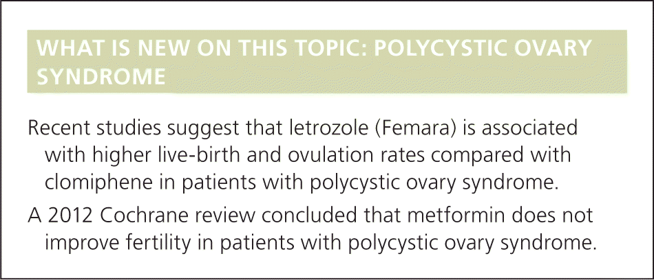 | Hormonal contraception (e.g., oral contraceptives) should be used as the initial treatment for menstrual cycle irregularity, hirsutism, and acne in patients with PCOS who are not actively trying to get pregnant. | A | 19, 30 |