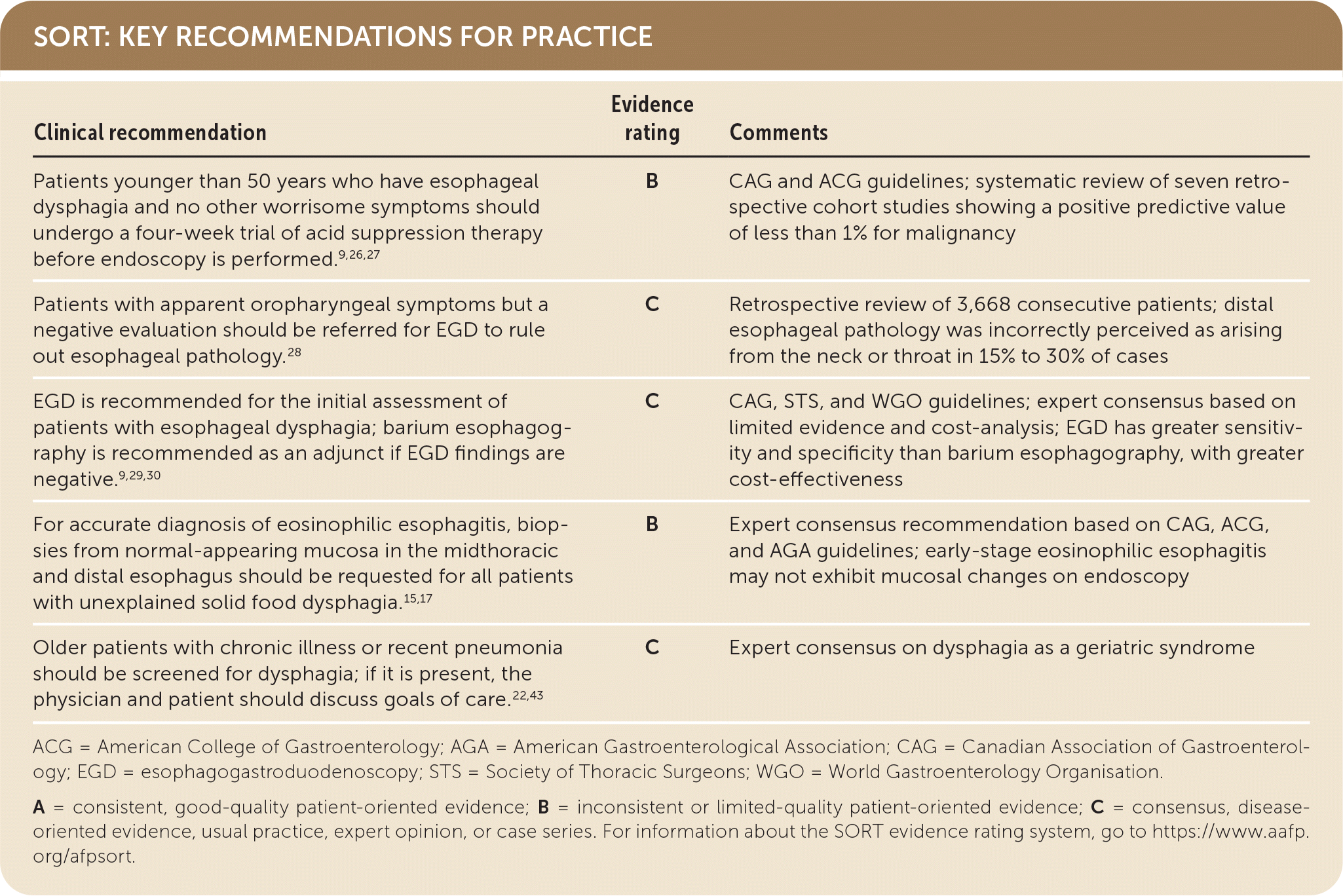 Patients with apparent oropharyngeal symptoms but a negative evaluation should be referred for EGD to rule out esophageal pathology.28 C Retrospective review of 3,668 consecutive patients; distal esophageal pathology was incorrectly perceived as arising from the neck or throat in 15% to 30% of cases