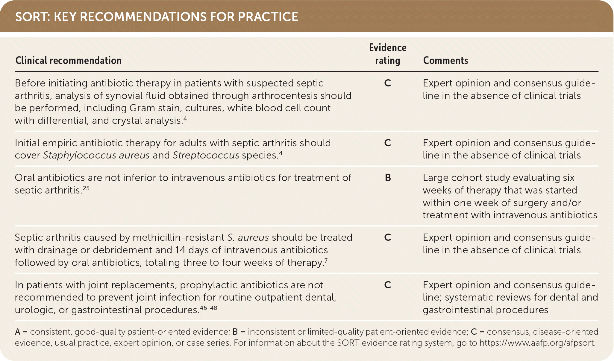 Oral antibiotics are not inferior to intravenous antibiotics for treatment of septic arthritis.25 B Large cohort study evaluating six weeks of therapy that was started within one week of surgery and/or treatment with intravenous antibiotics