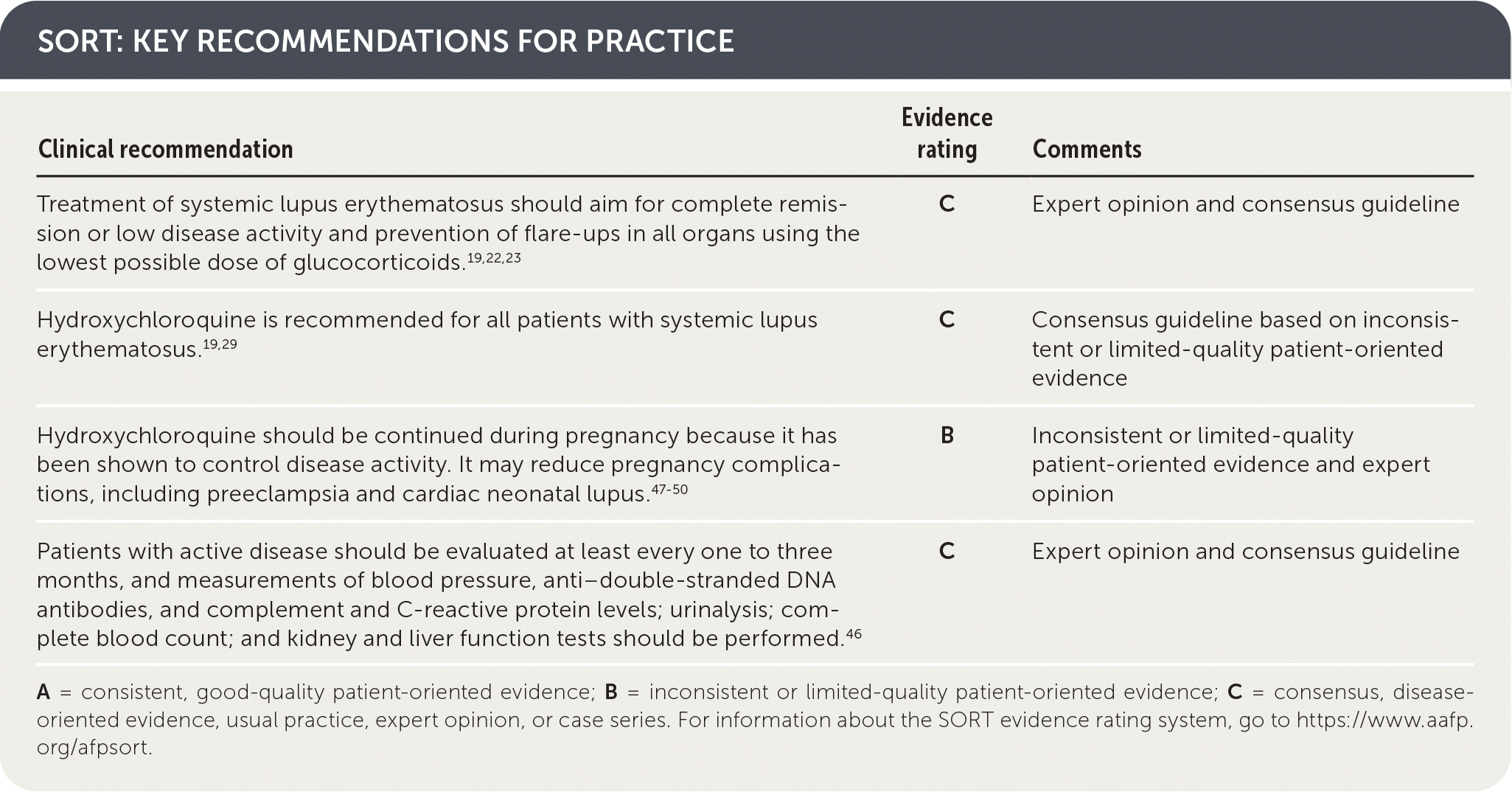 Hydroxychloroquine is recommended for all patients with systemic lupus erythematosus.19,29 C Consensus guideline based on inconsistent or limited-quality patient-oriented evidence