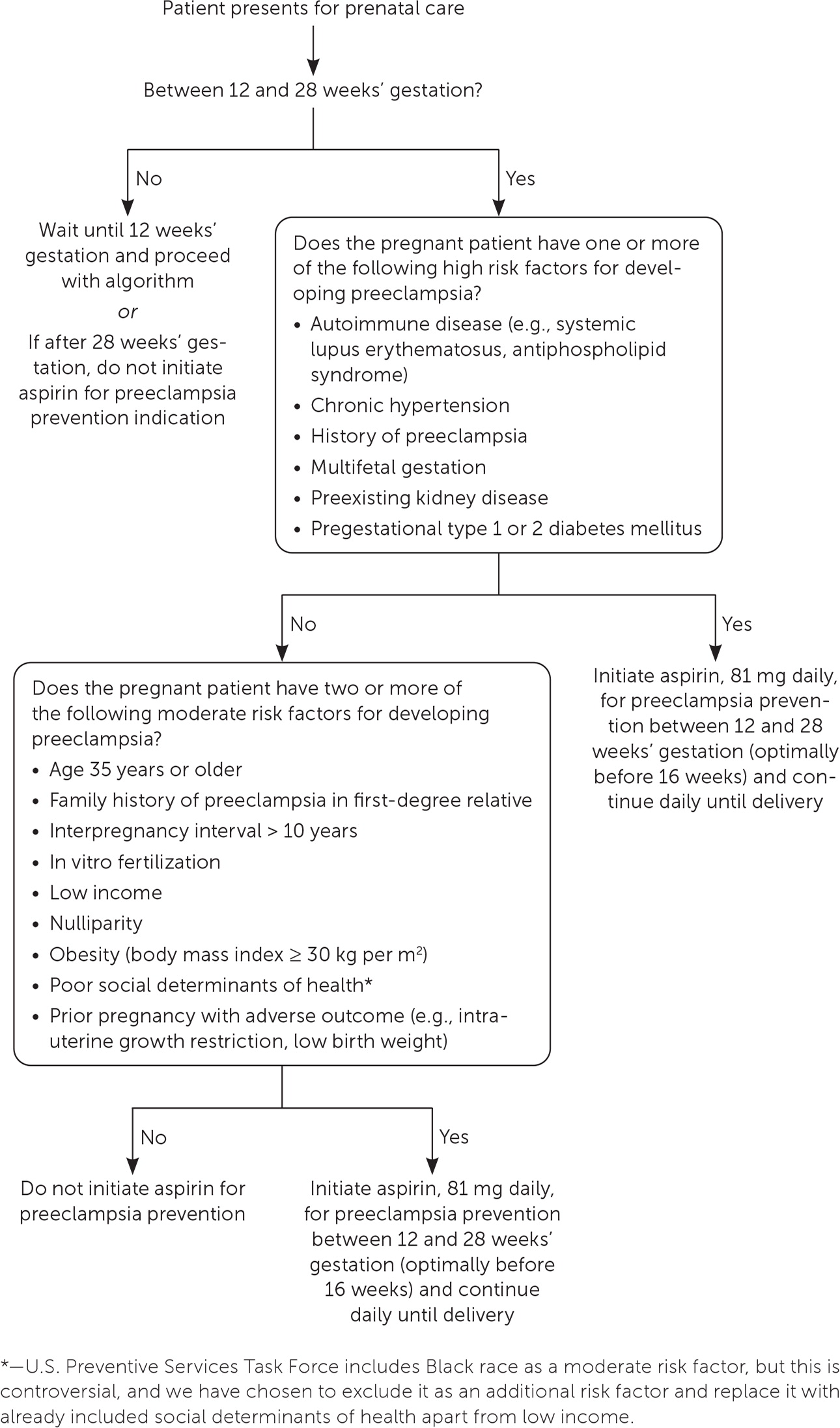 In contrast to other NSAIDs, low-dose aspirin is recommended by the U.S. Preventive Services Task Force and ACOG for women who are at increased risk of preeclampsia. Aspirin, 81 mg per day, should be initiated between 12 and 28 weeks’ gestation and continued until delivery (Figure 1).57–59 Consistent evidence from RCTs shows a significant risk reduction in peri-natal mortality, preterm birth, fetal growth restriction, and the risk of preeclampsia without an increased risk of bleeding.59 A small RCT demonstrated that low-dose aspirin does not increase the risk of ductus arteriosus constriction.60
