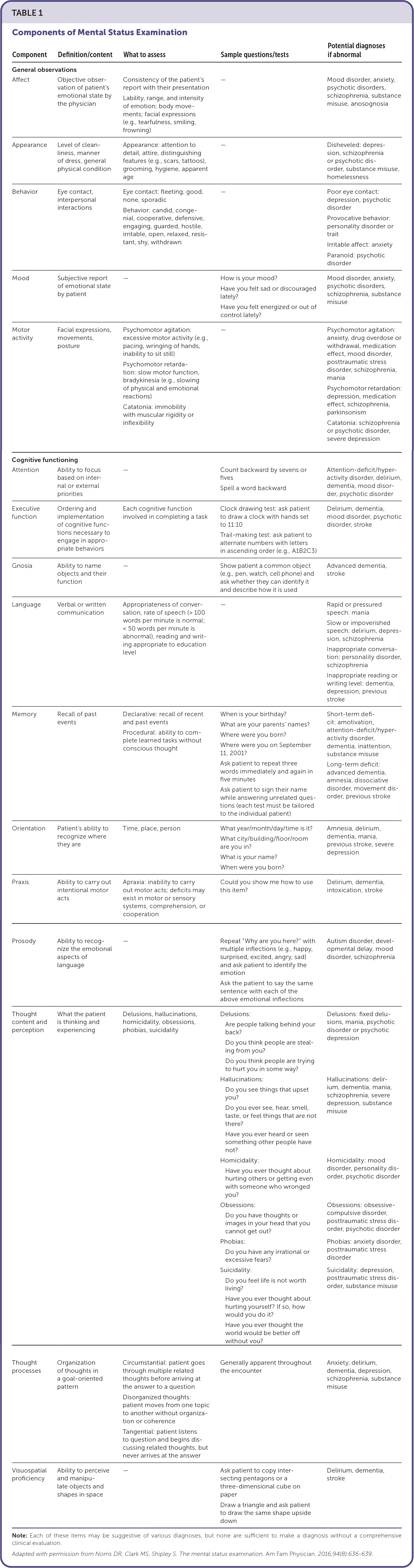 The MSE can be as simple as observing a patient or as comprehensive as using a formal evaluative tool. The examination includes evaluation of several cognitive domains, which have been reviewed in a previous American Family Physician (AFP) article3 and can help the primary care physician identify and distinguish a variety of conditions such as delirium, dementia, mania, or depression.