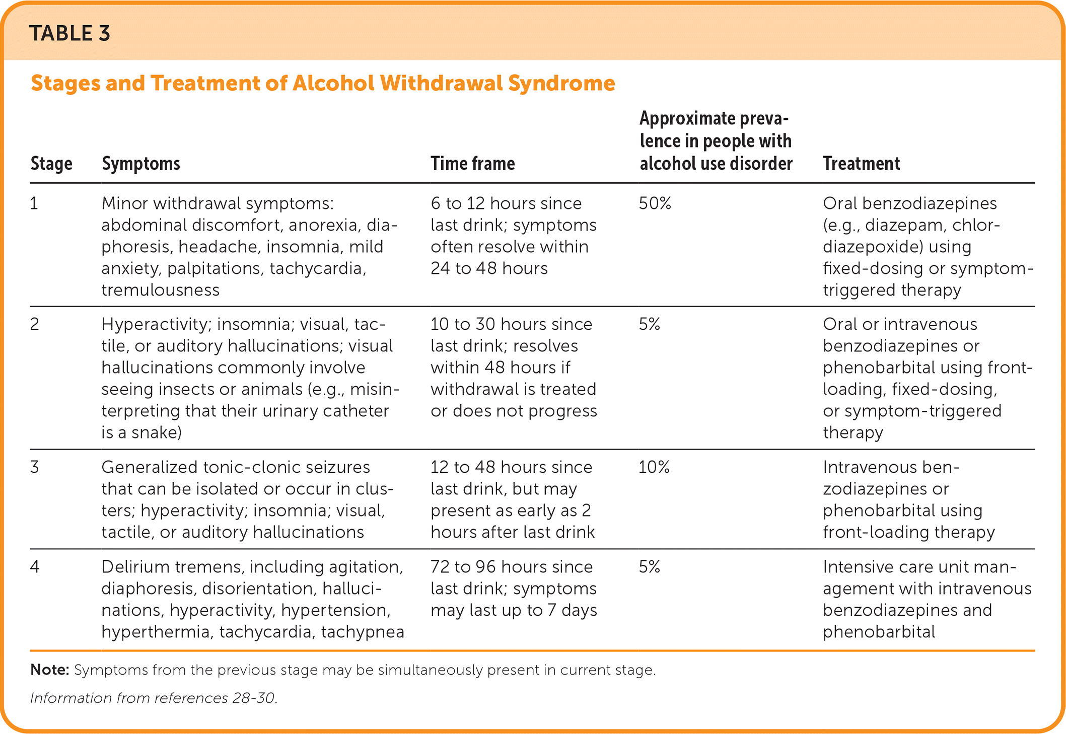 | 3 | Generalized tonic-clonic seizures that can be isolated or occur in clusters; hyperactivity; insomnia; visual, tactile, or auditory hallucinations | 12 to 48 hours since last drink, but may present as early as 2 hours after last drink | 10% | Intravenous benzodiazepines or phenobarbital using front-loading therapy |