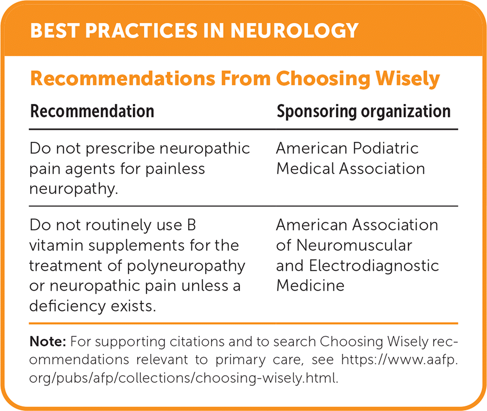 Several neuromodulatory strategies (e.g., spinal cord stimulation, transcutaneous electrical nerve stimulation) have demonstrated benefit for diabetic peripheral neuropathy, but the benefits are based on low-quality evidence. Spinal cord stimulation has demonstrated only potential benefit in case-control studies; possible limitations include adverse effects, expense, and surgical complications.17 Peripheral transcutaneous electrical nerve stimulation therapy has been studied in moderate-quality prospective trials with modest benefit compared with electromagnetic nerve stimulation with no serious adverse effects. Considering its safety and low cost, treatment with transcutaneous electrical nerve stimulation is preferable compared with other neuromodulatory techniques.21