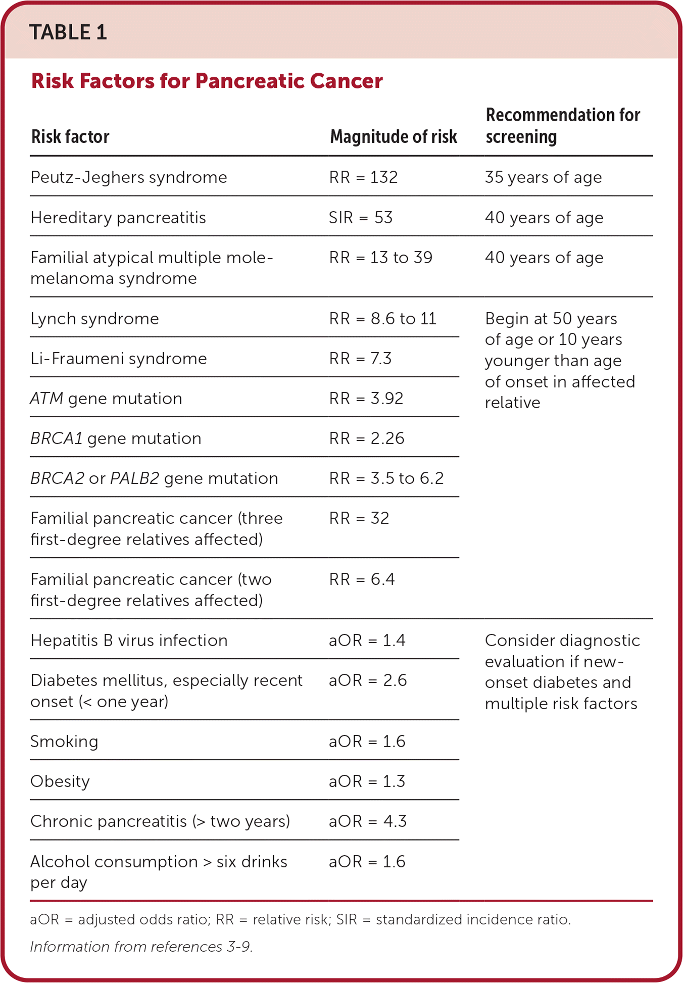 Pancreatic cancer is relatively uncommon and carries a poor prognosis because patients often develop signs or symptoms at a late stage of illness. Patients with a family history, especially those with genetic syndromes, are at a significantly increased risk of pancreatic cancer. Modifiable risk factors include smoking, heavy alcohol use, and obesity. Although patients at increased risk should be screened, screening is not recommended for asymptomatic people at average risk. The differential diagnosis for a symptomatic patient is broad, including gastroesophageal reflux disease, gastritis, peptic ulcer disease, chronic pancreatitis, biliary dyskinesia, cholelithiasis, gastroparesis, or constipation. Initial serologic testing should include transaminase and bilirubin levels, and in patients with midepigastric pain, lipase levels. Pancreas-protocol, contrast-enhanced abdominal computed tomography is the imaging test of choice. Carbohydrate antigen 19-9 is the most studied cancer marker and moderately accurate in patients suspected of having cancer; however, the positive predictive value is 0.9% in asymptomatic patients. Treatment includes neoadjuvant or adjuvant chemotherapy and surgery if the cancer is resectable. The treatment approach is best determined by a multidisciplinary, high-volume center. For a patient undergoing chemotherapy, nutritional and psychosocial support and palliation of symptoms should be goals during treatment.
