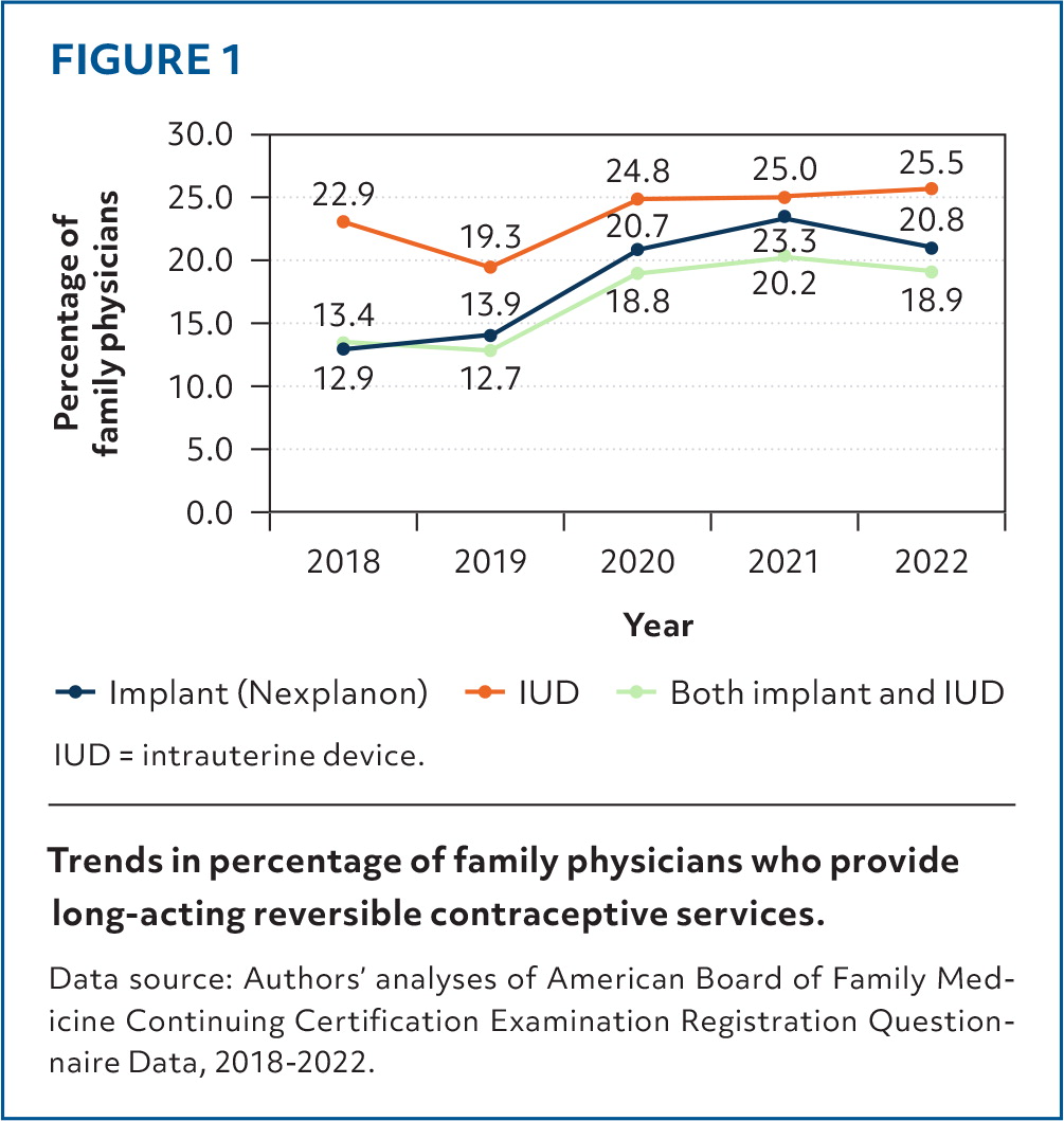 A 2019 report indicated that although LARC provision continued to rise, less than one-fourth of family physicians provided IUDs or implants.2 A 2021 Health Resources and Services Administration report found that obstetrician-gynecologists will provide only 51% of women's health services needed in non-metropolitan areas by 2030.3 This analysis shows how rates of LARC provision have evolved among family physicians and identifies the impact of practice location on the likelihood of providing contraceptive care.