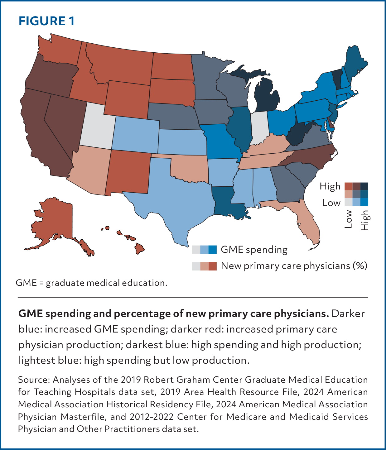 Figure 1 shows northeastern states receive high GME funding but produce a relatively low number of primary care physicians. Generally, southern states receive relatively low GME funding and produce a small number. Northwestern states receive low GME funding but produce a relatively higher number of primary care physicians (70.8) compared with the national average (69.8) of primary care physicians per 100,000 people. This number is still low compared with Canada, which averages 119 primary care physicians per 100,000 people.5