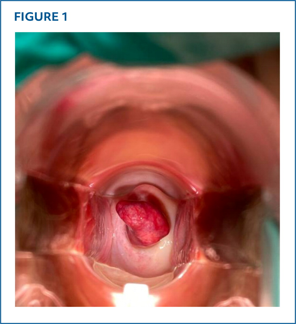 A speculum examination revealed a fleshy mass 3 cm in diameter protruding from the cervical os (Figure 1). No vaginal discharge or bleeding was noted.