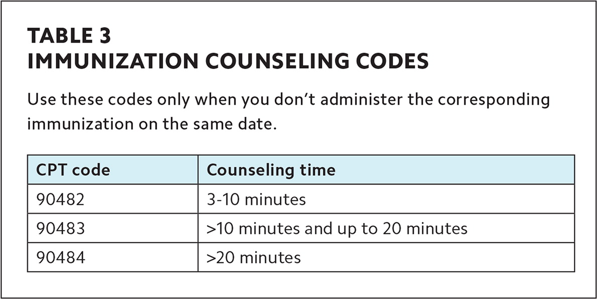Immunization counseling, administration, and product codes. CPT created three new time-based codes for immunization counseling when the immunization is not given on the same date of service. (See Table 3.) Clinicians can report the codes for counseling patients of any age. Time spent counseling for immunizations that were administered on the same date of service should not be counted toward the time for the new codes. Note that CMS did not adopt these codes. They have a status of “I” (not valid for Medicare purposes). Physicians may use E/M codes to report immunization counseling to Medicare where an immunization is not administered and may select the level of visit based on MDM or total time.